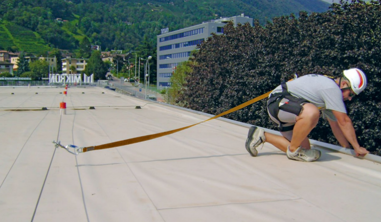 Durch die Vorgaben aus der Norm SIA 271, ist ein gefahrloser Unterhalt des Abdichtungssystems jederzeit zu ermöglichen. Ist die Absturzhöhe bei einem Flachdach oder Steildach höher als 2.00 Meter sind Sicherungsmassnahmen gegen einen Sturz über die Dachkante zu treffen. Bei nicht genutzten Dächern kann die Abstuzsicherung durch die Montage von EAP (Einzelanschlagpunkten) erreicht werden. Bei genutzten Dächern mit Solaranlage sind Seil oder Schienensysteme oder ein Kollektivschutz vorzusehen. Die Planung und Ausführung von solchen Anlagen müssen zwingend nach den Herstellervorgaben umgesetzt und die notwendigen Dokumentationen dazu erstellt werden.